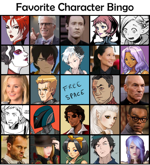 Middle row: Eleanor Shellstrop, Galahad (Aveyond), free space, Synox (Campaign/Evil Campaign), Picard (Star Trek: The Next Generation)