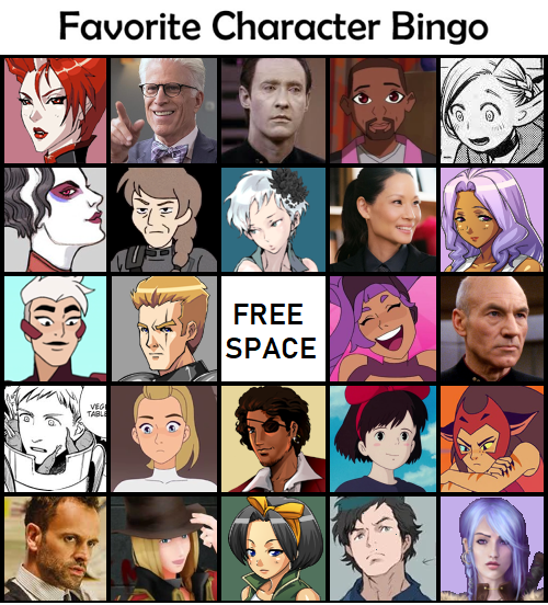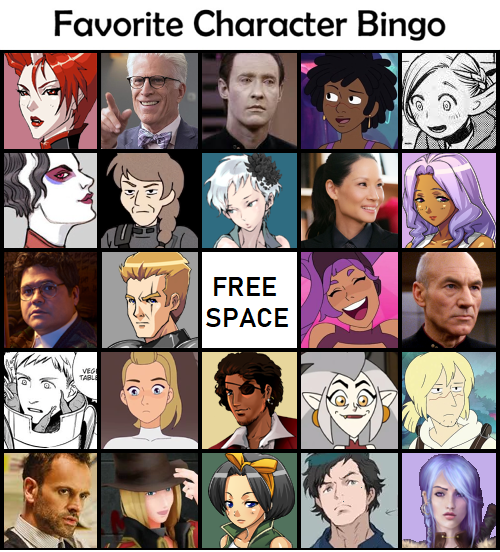 Middle row: Scorpia (She-Ra and the Princesses of Power), Galahad (Aveyond), free space, Entrapta (She-Ra and the Princesses of Power), Picard (Star Trek: The Next Generation)