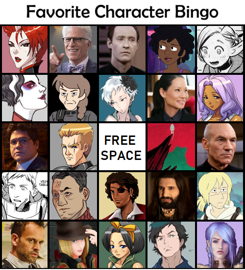 Middle row: Guillermo (What We Do in the Shadows), Galahad (Aveyond), free space, the Ghost/22 (Archivist Wasp, Latchkey, Firebreak), Picard (Star Trek: The Next Generation)