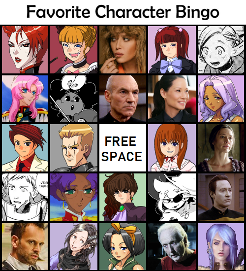 2nd row: Utena Tenjou (Revolutionary Girl Utena), Mirabelle (In Stars and Time), Picard (Star Trek: The Next Generation), Joan Watson (Elementary), Stella (Aveyond)